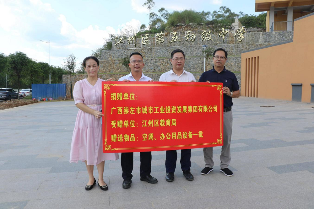 2025年8月28日下午,崇左市工投集團(tuán)向江州區(qū)捐贈(zèng)教育物資儀式在江州區(qū)第五初級(jí)中學(xué)舉行。崇左市工投集團(tuán)黨委副書(shū)記黃祥葉,江州區(qū)人民政府副區(qū)長(zhǎng)陸永住,江州區(qū)教育局、江州區(qū)第五初級(jí)中學(xué)主要負(fù)責(zé)人出席儀式。儀式照片崇左市工投集團(tuán)捐贈(zèng)了一批辦公桌椅、空調(diào)、辦公用品設(shè)備等物資,總價(jià)值約70萬(wàn)元,為即將開(kāi)學(xué)的學(xué)校